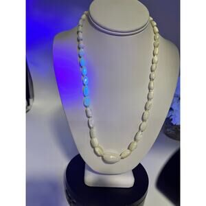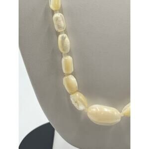 luminous oval beads with beautiful iridescent qualities. This elegant single-strand necklace showcases the natural beauty of genuine shell with lovely cream, pale yellow, and white tones. The lustrous nacre finish gives each bead a beautiful pearlescent glow that catches the light beautifully.