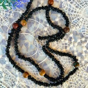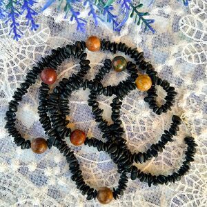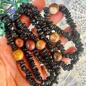 Lovely & long! Raw natural Black Onyx chalcedony gently smoothed chip beads.  Natural pure black onyx is rare these days - as most is heated and polished to get that pure black look. These fabulous raw Black Onyx tumbled chips are combined with larger round natural Red Creek Jasper beads for a lovely black/brown combo. 39” long - can just slip over the head, knot, or double.
