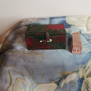 Hand Carved Dragon Stamp made from quartz. Tested with Presidium 11. Comes in red and green tapestry box with bone closure. Excellent condition. Silk padding in box. Box - 3 1/2" x 2" x 1 1/2" Stamp - 2 3/4" x 3/4" Marked M D