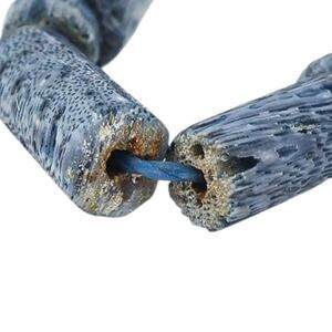 Beautifully restrung necklace featuring rare natural blue coral (Heliopora coerulea) and Mediterranean red coral heishi beads, finished with a silver-tone starfish charm. The organic grain, matte patina, and visible porous texture indicate untreated, vintage coral.