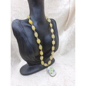 Vintage Natural Yellow Stone Beaded Necklace With Abstract Handcrafted Tile Pend