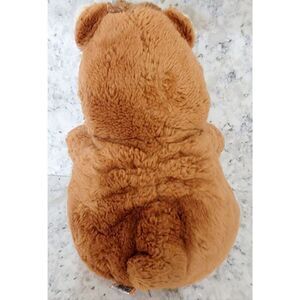 This vintage Nature Babies plush stuffed animal is a 1982 R. Dakin Bumpkin Bear, perfect for children 3 years and up. Measuring 9 inches in size, it is a small and cuddly toy that will make a great addition to any stuffed animal collection. The bear is made by Dakin, a well-known brand in the world of stuffed animals, and is designed to look like a cute and friendly animal.
