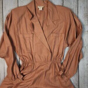 The Vintage Naturelle Raw Silk Shirt Dress by George Georgiou is a stylish and unique piece perfect for everyday wear. Made from 100% raw silk in a solid burnt orange color this piece has pockets, a stretch lyrics waist and notorious 80s shoulder pads