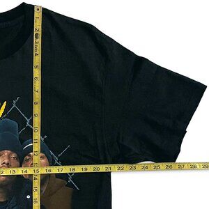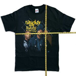 A vintage tee from the pioneering Hip Hop crew Naughty By Nature from 1993. A RARE FIND! The trio from East Orange, New Jersey scored a major hit with with the bouncy cut "O.P.P." The follow-up - "Hip Hop Hooray" - was a success from the album 19 Naughty III. Its video was directed by Spike Lee and featured cameos by Queen Latifah, Eazy-E, Run-D.M.C., and Da Youngstas. The trio's next offering - "Poverty's Paradise" won the Grammy Award in 1996 for Best Rap Album, becoming the first album to win this award.