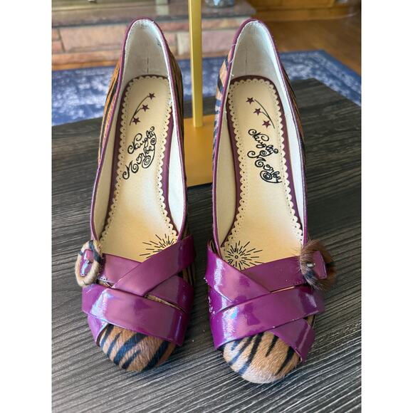 Vintage Naughty Monkey Purple Animal Print Heels with Mini Buckle Sz. 9.5
