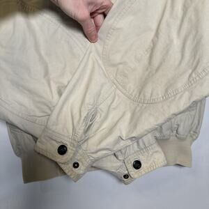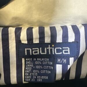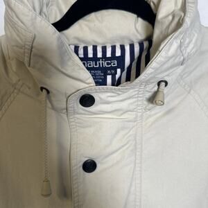 This is a vintage Nautica men's beige jacket in size medium. It features a striped inner lining, a mid-length bomber style, and a softshell fabric type. The jacket has a zip, button, and snap closure with button and zipper accents. It is suitable for travel, casual wear, and workwear, and is designed with a nautical, outdoor, and 90s theme. The jacket is lined with cotton and is recommended for dry clean only.
