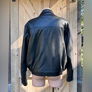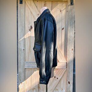 This Vintage Nautica Men's Black Genuine Leather Aviator Flight Bomber Jacket has a zipper up the front, two snap flap/hand pockets, snaps on the wrists and a quilted lining. It is 24" armpit to armpit, 27" from the shoulder to the wrist, 23" across the back shoulders and 27 1/2" long.