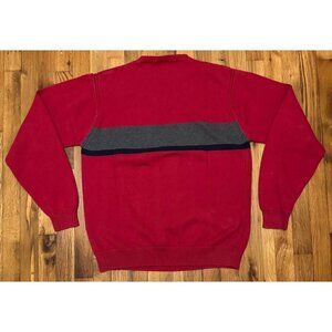 Vintage Nautica red crewneck sweater featuring a gray and navy chest stripe with the bold Nautica logo across the front. Soft 100% cotton knit with ribbed neckline, cuffs, and hem. Tagged size L. Recently dry-cleaned and in like-new vintage condition.