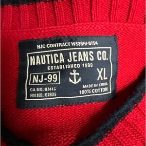 Step up your style with this vintage Nautica Jeans Co. red V-neck sweater! Made from 100% cotton, this classic sweater is perfect for adding a pop of color to your wardrobe. In excellent condition, it's ready to wear and impress. Don't miss out on this timeless piece!