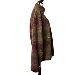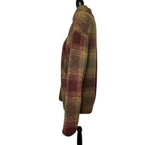 Stay cozy and stylish in this vintage Nautica Sherpa fleece pullover, featuring a classic plaid design in earthy tones of green, burgundy, and mustard.
