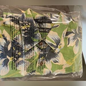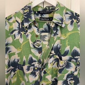Vintage Nautica Shirt Mens Medium Green Blue Hawaiian Floral Aloha Linen Blend