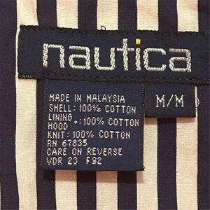 Keywords: Nautica, women's jacket, medium, cotton, red, striped, hooded, lightweight, breathable, spring jacket, zip closure, logo, Malaysia, machine washable, vintage.
