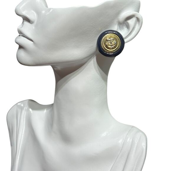 These earrings are pierced post-style, offering a comfortable yet substantial look. The navy and gold color combination makes them versatile for both casual and dressy outfits, complementing everything from blazers and striped tops to evening wear. A perfect choice for lovers of nautical, preppy, and vintage fashion.