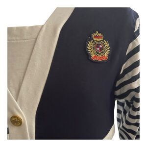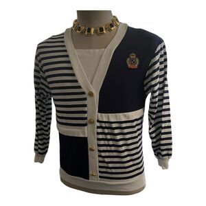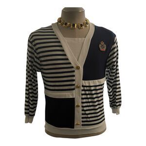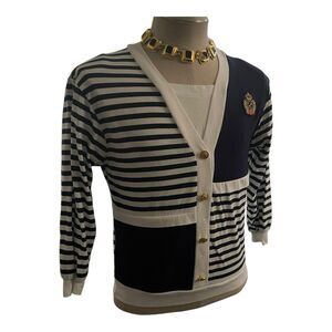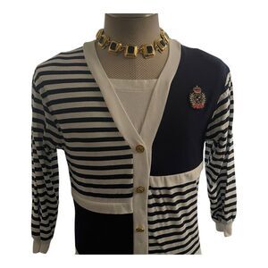 This Vintage Nautical Cotton Knit Top in size 14 features a stylish striped pattern in navy and white, perfect for a cruise vacation. The 3/4 sleeve and square neckline add a touch of sophistication, while the casual mock cardigan style makes it versatile for everyday wear. Made from machine washable knit fabric, this top from the brand Philly is a great addition to any woman's wardrobe, ideal for the summer and spring seasons with a nautical theme in mind.