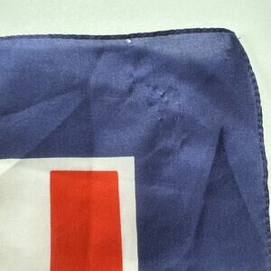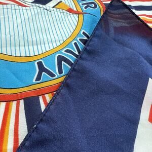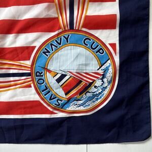 Bold vintage nautical scarf with a striking sailor regatta motif. Features red and white stripes with navy, yellow, and orange accents, framed by a navy border. One corner shows a round sailing emblem with “Sailor Navy Cup” and a colorful sailboat graphic — perfect for coastal, yacht club, and Americana-inspired looks. Lightweight silky fabric with rolled hem edges.