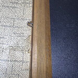 Selling a Vintage Nautical Wooden Framed Dockside Fishing Boat Linen Wall Art Print. The frame measures 14.75" (h) x 15.5" (w) x 1.5" (d), and the print itself measures 12.75" (h) x 13.5" (w). The frame and backside of the print have some wear, but it's in otherwise good condition.
