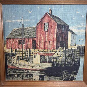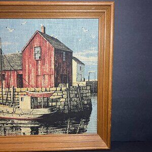 Vintage Nautical Wooden Framed Dockside Fishing Boat Cove Linen Wall Art Print