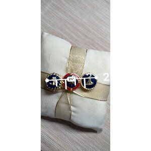 • Gold-tone metal with navy & red enamel accents