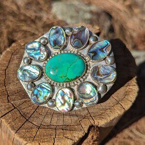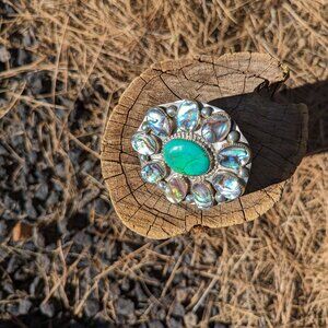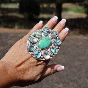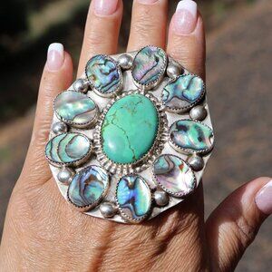 A beautiful & rare one-of-a-kind Navajo ring with traditional cluster design. Made of sterling silver with green turquoise center and mother of pearl surrounding. Handmade by Navajo, unsigned. Traditional tribal artwork, intricate details. Collectible quality Native American jewelry.