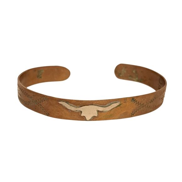 Vintage Navajo Solid Copper with Sterling Silver Cuff Bracelet Marked DP Rodeo Longhorn