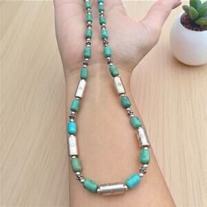 Beautiful handcrafted turquoise and sterling silver necklace featuring a mix of natural turquoise nuggets and hand-stamped barrel beads. The turquoise displays classic blue-green matrix variations, paired with oxidized silver spacers that give this piece a distinct Southwestern charm.