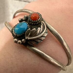 Vintage Navajo Sterling Turquoise And Coral Cuff Bracelet