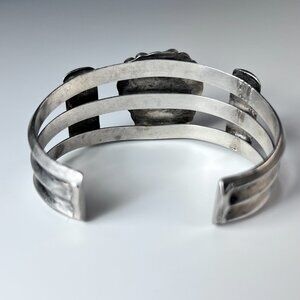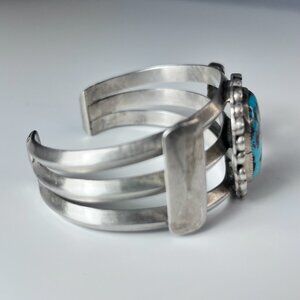 Beautiful vintage Navajo sterling silver cuff bracelet with a stunning piece of turquoise surrounded by flower-like silver work. The cuff measures about 5 1/4 in around the inside with a gap that measures about 1 1/4 in wide. The turquoise stone measures about 1 in tall and about 3/4 in wide, at the widest part. We notice there are two spots around the design that are missing(around the area that looks like small petals made of silver). This piece is not marked.