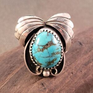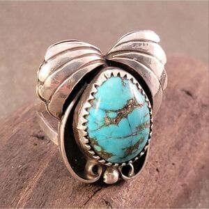 Striking Old Pawn sterling natural blue turquoise with dark brown matrix ring. The piece is tested and confirmed as sterling. Signed by the artist.