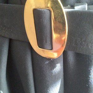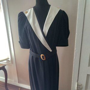 This is a classic historical designer Louis Féraud's vintage women’s blue and white 100% light wool dress. Lined with a hook at the waistline, it features a belt with a buckle, a hook, and gold epaulets on the shoulders.