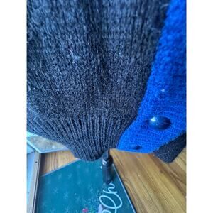 Charming vintage cardigan sweater with a navy blue base and aqua floral motif, size M. Cozy knit with classic button-front styling, perfect for layering. Brand tag not visible and fabric tag is missing—priced accordingly. Beautiful vintage character that adds color and personality to any wardrobe