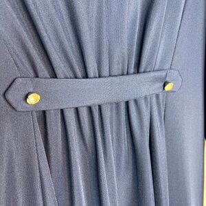 Vintage Navy Blue Evening Dress Rhinestone Buttons Long-Sleeves V-Neck Gathered