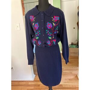 Keywords: vintage, knit dress, cardigan set, floral embroidery, navy blue, cottagecore, sweater dress, retro, vintage knit set, embroidered dress, knit skirt set, vintage clothing, long sleeve dress