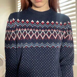 Cozy and classic navy blue Fair Isle sweater with intricate knit patterns in red, white, and blue. Soft, warm, and perfect for winter layering! Features a ribbed hem and cuffs for a snug fit.