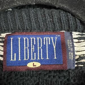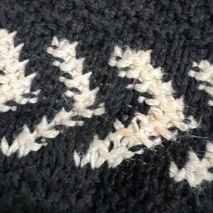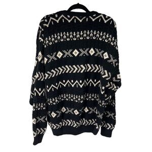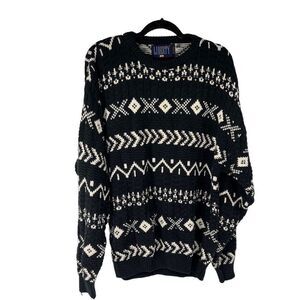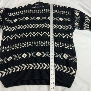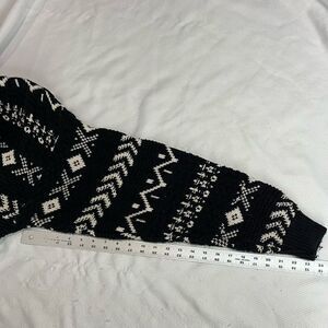 Vintage Navy Blue White Print Textured Sweater. Size large with measurements in the pictures. Gently used condition with no rips but has a small stain shown in the picture.