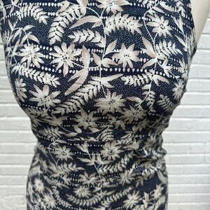 Vintage navy and cream sleeveless midi dress in a dense botanical print. Lightweight rayon with a soft drape and subtle sheen. Scooped neckline, darted bust, and a slightly tapered waist for a flattering silhouette. Back zip closure, unlined.