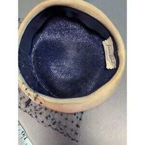 Vintage Navy & Cream Pillbox Hat With Red Trim & Black Veil Sz 22"