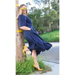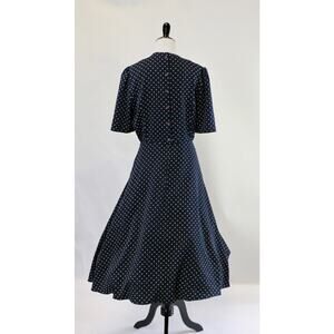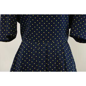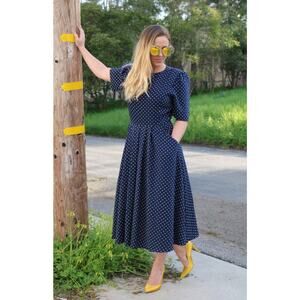 Vintage 1980s navy dress with yellow polka dots. Pockets. Back zipper and 6 buttons up the back. A very 1950s silhouette. Full skirt. B.G. street label.