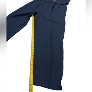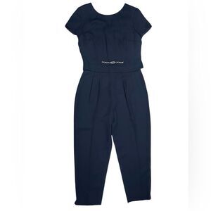 Elegant and timeless, this Liz Claiborne navy blue jumpsuit is a sophisticated addition to any wardrobe. Featuring a cropped top overlay with cap sleeves, shoulder pads, and a delicate silver chain accent at the waist, this one-piece outfit blends classic style with modern charm. The tailored pleated pants create a flattering silhouette, perfect for formal occasions, workwear, or evening events.