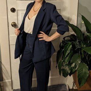 I adore this vintage power suit. The blazer has a tie front but the underside is double breasted so it's not going anywhere if it comes untied. It has light shoulder pads but they could be taken out. Both pieces are marked a size 4P. The jacket is pretty true to size but the pants run a bit small and it's the only reason I'm listing it. Would best fit a size 2P or a slim hipped 4P. Fabric is silky and it's in amazing vintage condition.