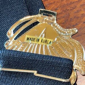 Super dark navy almost black wide stretch belt. Gold, buttercream and black enameled metal large butterfly front clasp buckle. Excellent vintage condition. Waist 30” un-stretched. Made in Korea