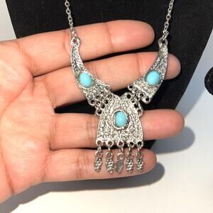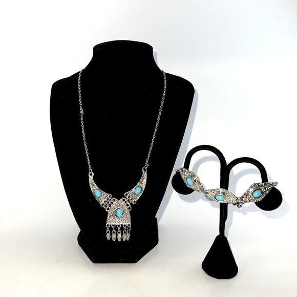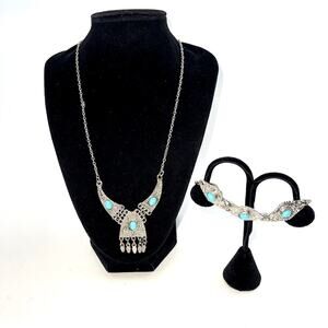 Vintage Necklace & Bracelet Silver Tone Turqouise Bead Hanging Metal Pendant B8