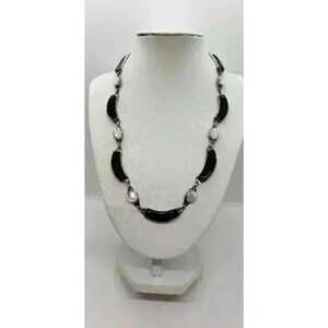 Fantastic set from the 40s or 50s period this is a segmented necklace and matching cliff earrings period the clip earrings are marked Hong Kong. The Long segments are filled with black onyx and the smaller oval segments are filled with mother of pearl. The metal does not appear to be Sterling and is probably stainless or similar