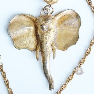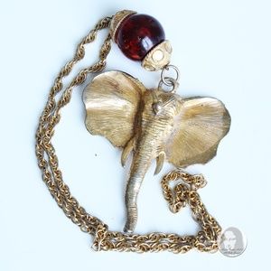 Preowned, vintage Elephant pendant with large red accent stone and necklace, likely made in the 80s. Great figural piece for the animal lover! Pendant measures approximately 4.5in H (including red stone bale) and necklace has a 16in drop. Preowned/vintage with signs of use and prior wear: scratching and color loss to elephant pendant, most notable to the back (see last image). Scratching to red accent stone. No metal content or manufacturers stamp.