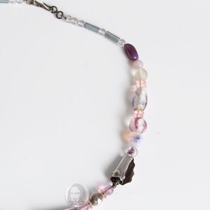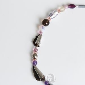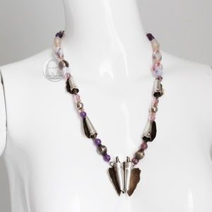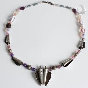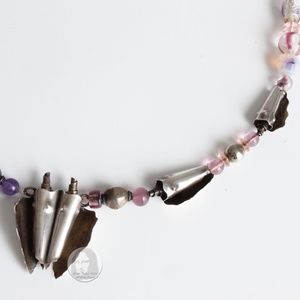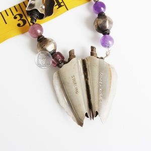 Preowned, vintage necklace with semi precious stones and sterling silver abstract scrolls, made by Southern California artisans Jeremy & Carrie Gicker. Made in 1987, this unique necklace features semi precious stones in shades of purple and pink, with sterling silver cone-shaped scrolls throughout. Stamped GICKER 1987 and STERLING on the center piece. Hard to find nowadays as the Gickers are now retired! Preowned/vintage (30+ years old) with signs of use and prior wear: scratches and some tarnish, most notable to the silver pieces. Approximately 12in drop (total length is appx 23in); center sterling piece is appx 2in H x 1.8in W.