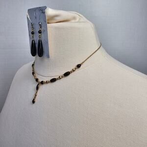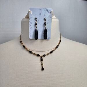 Vintage Necklace Set Goldtone Acrylic Faux Onyx Black Bead Dangle Drop Earrings