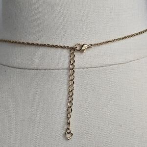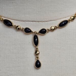 >>Goldtone necklace with faux onyx acrylic black and goldtone bead stations, measures approximately 16 inches, has a 2 inch extender and is in good preowned condition.
