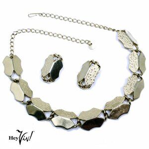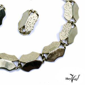 Vintage Necklace and Clip On Earring Set Smooth Textured Linked Shapes - Hey Viv