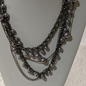 DARK SILVER CHAIN. Blue/grey pearl accents. Layered with adjustable Clasp.