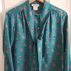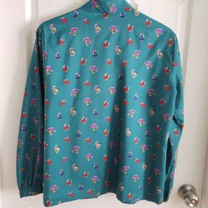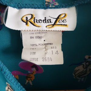Adorable teal button-up blouse with bowtie neckline. The vintage brand is Rhoda Lee from the 1970s. Old polyester material, but comfy and in great vintage condition with minimal signs of wear. Some tiny loose threads here and there, but not even big enough to show up in photos. The pattern is unique with multi-colored dancers in red, blue, yellow, and purple. The size on the tag says 14, but this fits most like a US 8-10.
