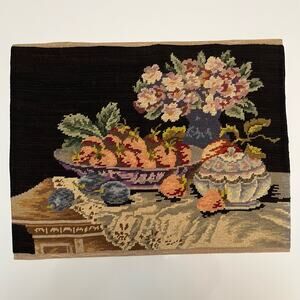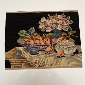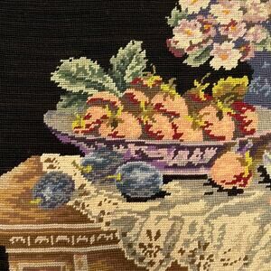 Good Condition Vintage 1965 Needlepoint Canvas of Flowers and Fruit on Table.